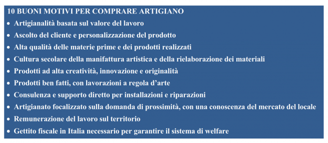 Se ne possono elencare almeno dieci: oltre al valore del lavoro, la qualità delle materie prime e lavorazioni a regola d'arte, anche l'ascolto del cliente e la personalizzazione del prodotto; la cultura secolare della manifattura artistica e della rielaborazione dei materiali; l'alta creatività, innovazione e originalità; la consulenza e il supporto diretto per installazioni e riparazioni; l'attenzione alla domanda di prossimità, con una conoscenza del mercato del locale; la remunerazione del lavoro sul territorio; il gettito fiscale necessario a garantire il sistema di welfare.