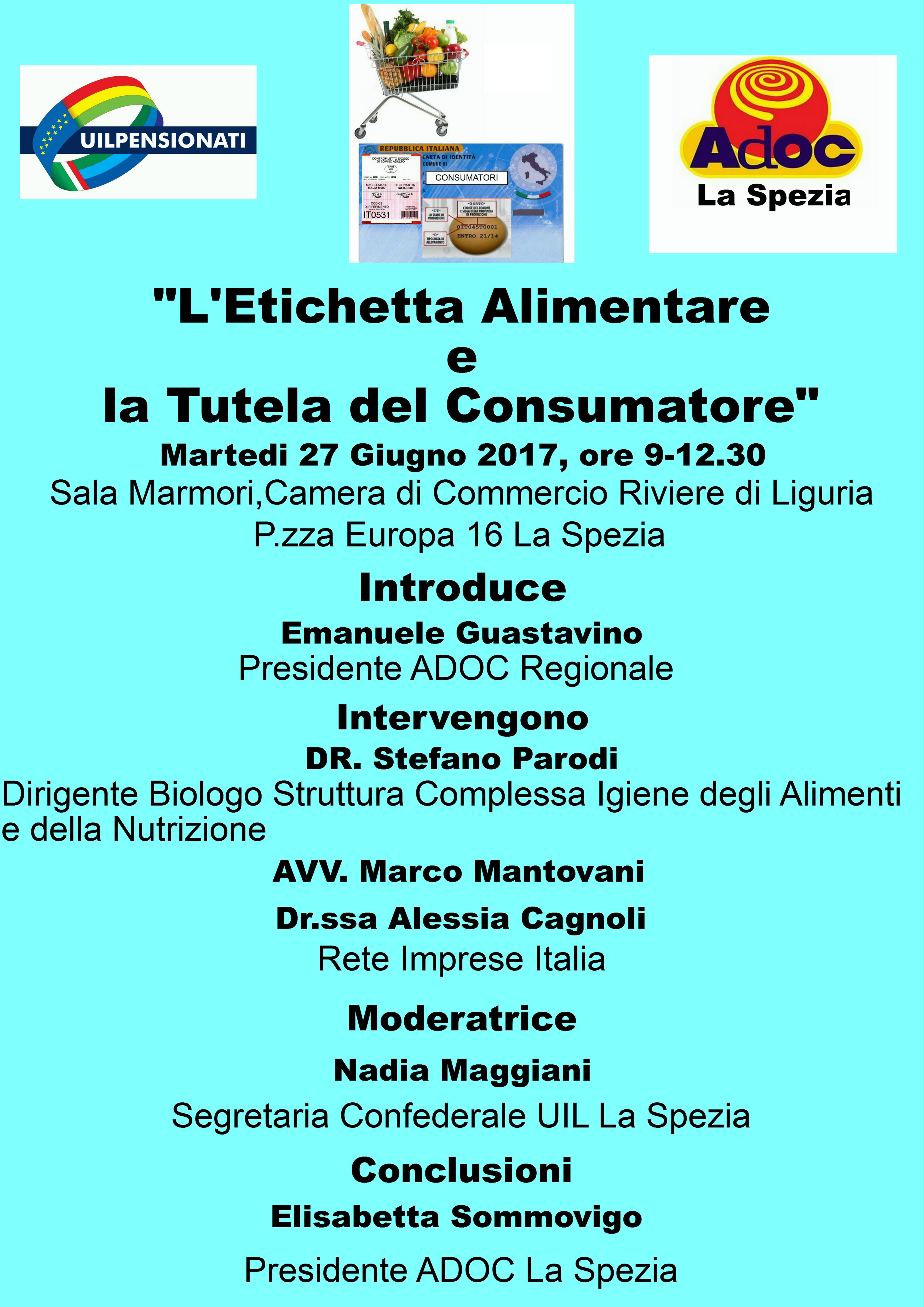 Martedì 27 giugno 2017 dalle ore 9.00 alle 12.30 presso la Sala Marmori della Camera di Commercio in Piazza Europa si terrà il convegno organizzato dall'Associazione consumatori Adoc e Uil Pensionati dal titolo "L'etichetta alimentare e la tutela del consumatore". Interverranno il dott. Stefano parodi, Dirigente ASL, l'Avv. Marco Mantovani e per Rete imprese Italia la dott.ssa Alessia Cagnoli, addetta dello sportello alimentare di Confartigianato. L'incontro è aperto al pubblico.